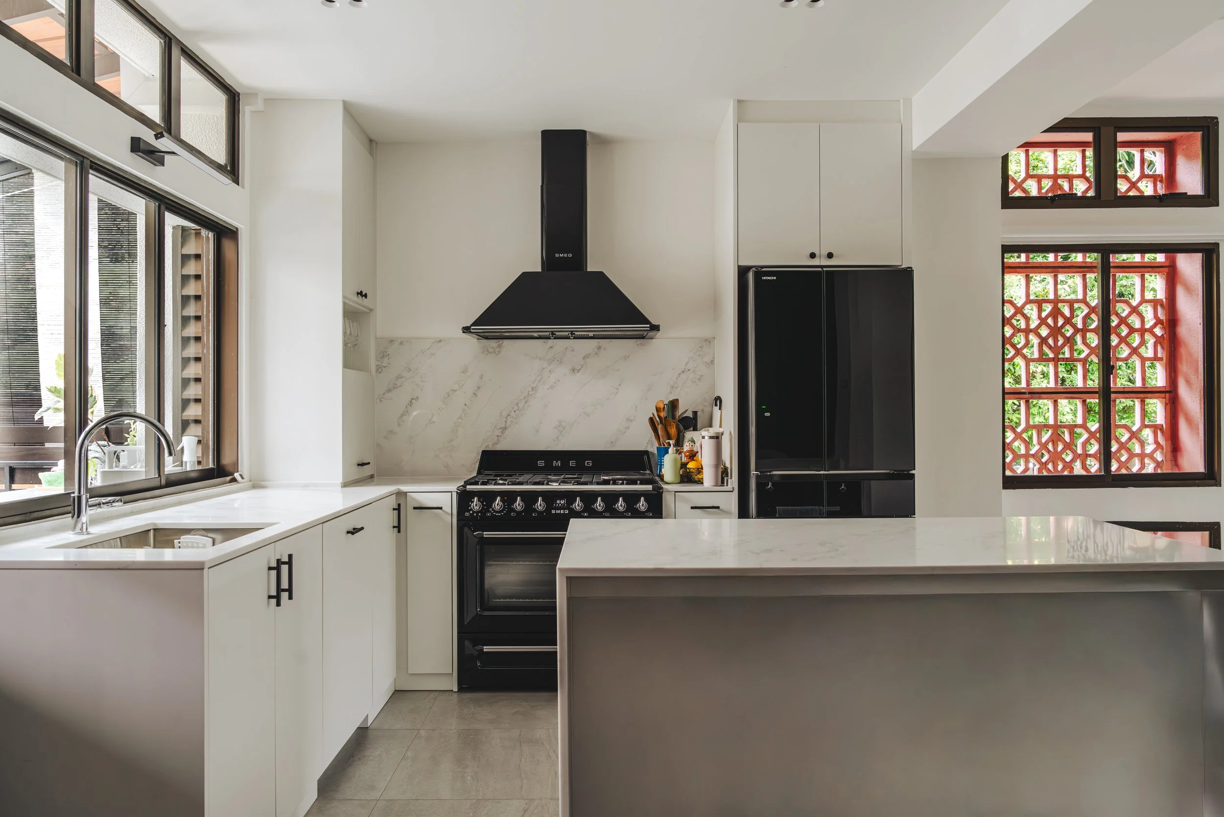 We used a minimalist colour palette, black handles, and durable countertops to ensure the kitchen looks modern yet stays functional for years.